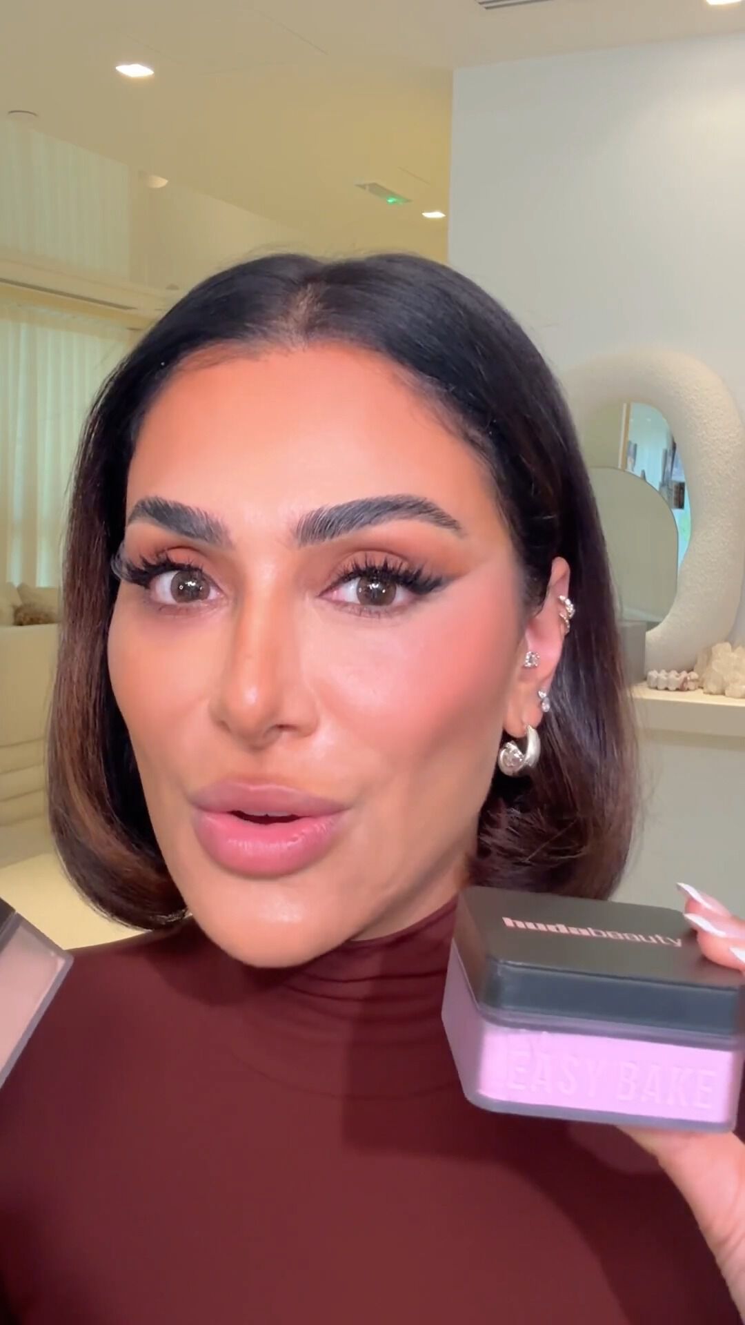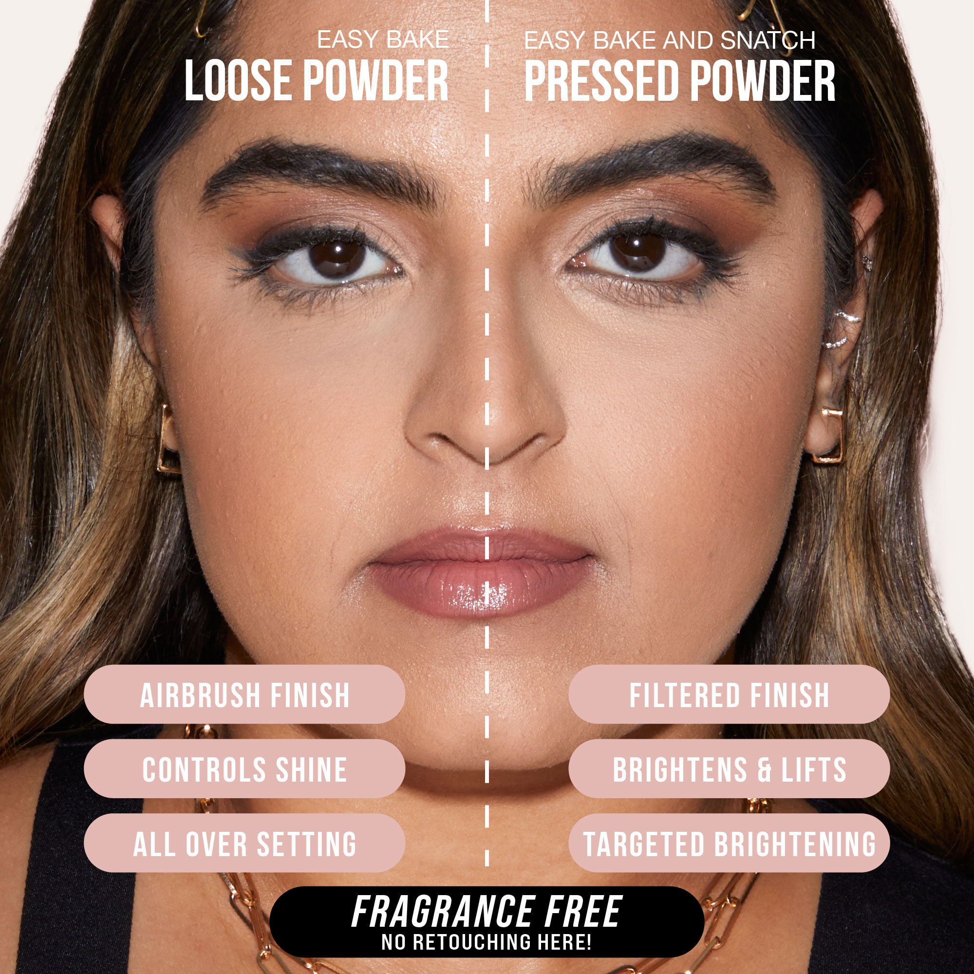 A dusting of Easy Bake leaves a translucent veil on the skin creating a matte finish that controls shine, color corrects, and highlights the different contours of the face without creasing or fading – the ultimate step to an airbrushed finish.