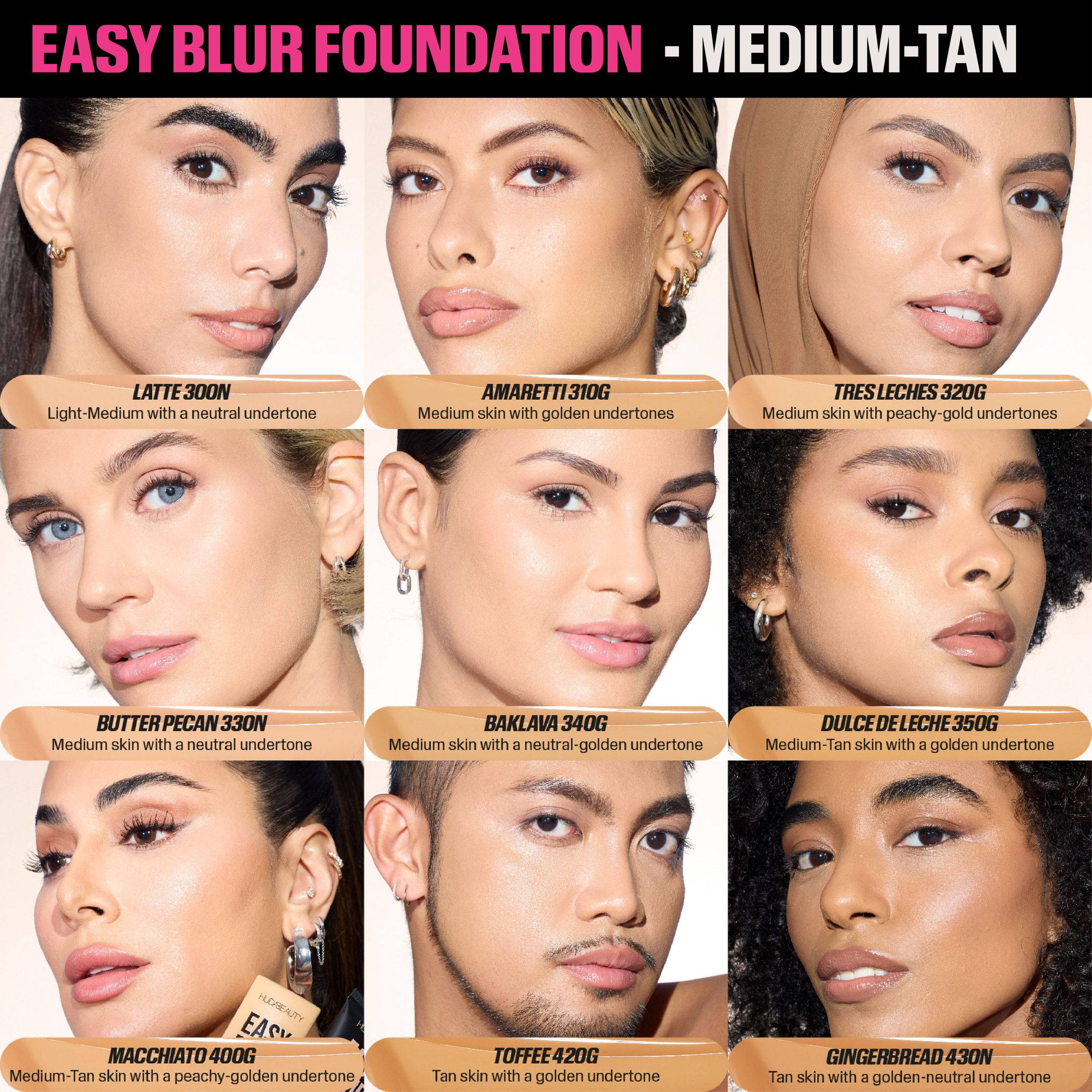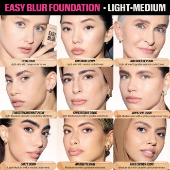 Foundation: This is not a filter! Our Easy Blur Foundation is a weightless, real-life filter foundation that’s ultra-blurring and smoothing for an easy airbrushed finish. With medium-to-buildable coverage for foolproof, seamless, easy application. The Easy Blur foundation comes in 29 shades.