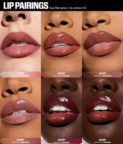 - Apply FAUX FILLER Gloss in shade Glassy for the juiciest lip combo.