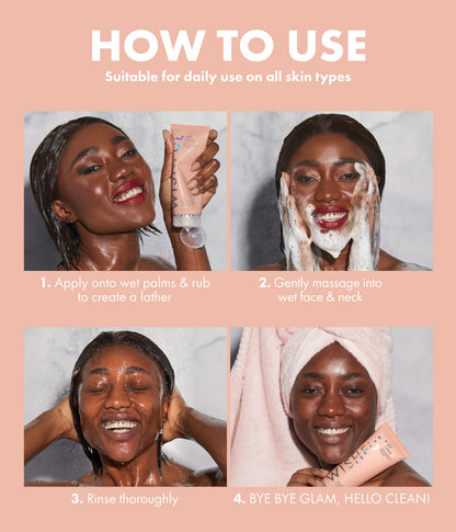 - Dispense small amount into wet palms and rub together to create a foamy lather.