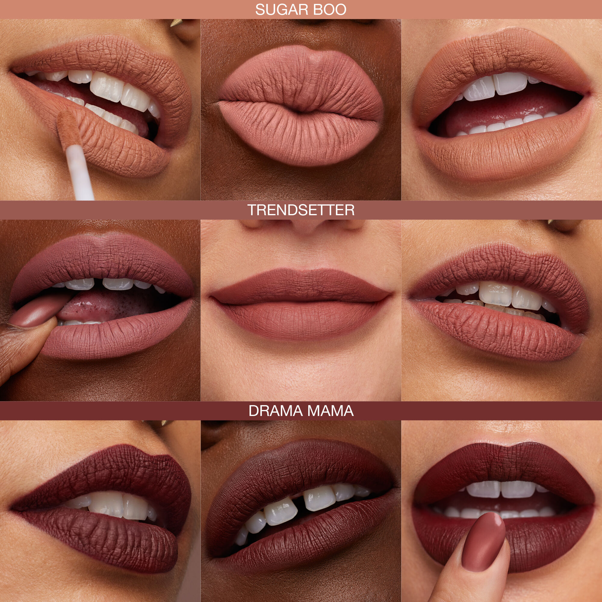 Now with an extended shade range suitable for ALL skin tones, our iconic, game-changing liquid matte lipstick has also been upgraded to be vegan friendly with the most comfortable, weightless formula! Still easy to apply, velvety and vibrant AF, it keeps lips supple with max color payoff for 8hrs!